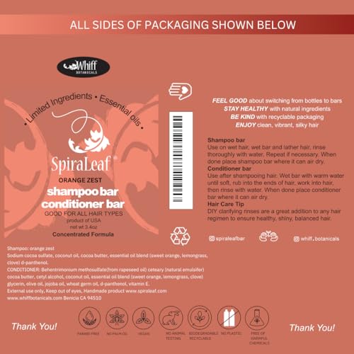SpiraLeaf Shampoo Bar & Conditioner Bar Set, ORANGE ZEST Pure Essential Oils, Light Scent, Limited Ingredients, Made USA